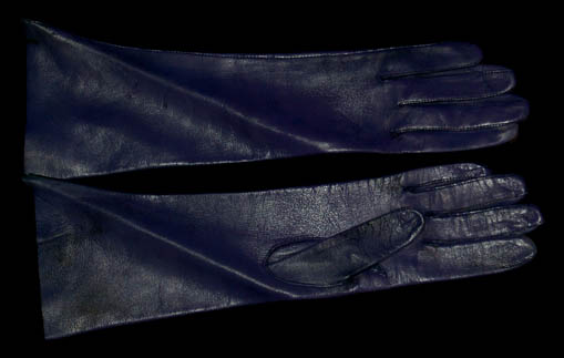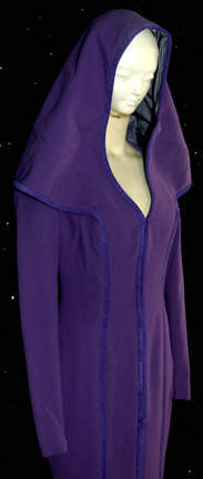 Description: A costume featured in the Star Trek: Deep Space Nine episode “A Simple Investigation”, wherein “Odo” (Rene Auberjonois) finds that he has fallen in love with a strange newcomer to the station who seems to have been targeted for murder. The costume is for wear by Dey Young in the role of the “Arissa”, the Idanian Intelligence operative sent to infiltrate the Orion Syndicate, and is a full-length, long-sleeved, low v-necked robe with an oversized hood, darker purple, leather, vertical accents, a zip down the front, corresponding purple leggings, and purple vinyl gloves. A sewn in tag reads ‘Deep Space Nine, Dey Young' and the costumer’s tag reads ‘DS9 #519, Arissa, Dey Young’.