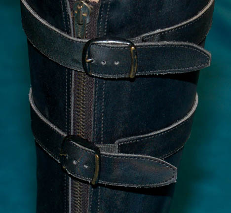 Description: A costume featured in the Star Trek: DS9 Star Trek: DS9 episode “The Emperors New Cloak” for wear by Nichole De Boer during her portrayal of “Ezri Dax”. The costume is black leather trousers with braided string accents down the outside seams, a short sleeved suede shirt, and a cropped black leather jacket with faux reptile skin pattern. The costume also comes with black leather zip front boots, a leather belt with metal studs affixed all around and a black nylon sheath with black leather accents, and a second belt made from black leather strips woven to appear as chain link with a molded resin holster. The costume pieces feature affixed Deep Space Nine tags reading ‘Nichole De Boer' and the costumer’s tag reads ‘#562 DS9, Emperor’s New Cloak, Ezri Dax, Nichole De Boer’ and lists the components.