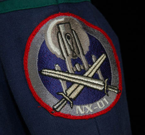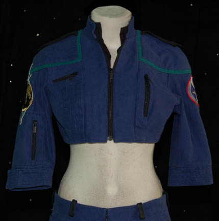 Description: An extremely rare costume featured in the Star Trek: Enterprise episodes “In a Mirror, Darkly, Parts I and II” for wear by Diana Lee Inosanto. The costume is a Starfleet Uniform from the Mirror Universe, thus it is hip hugging cropped trousers with a midriff bearing cropped uniform top with cropped sleeves. The uniform features sciences blue division strips around the shoulders, black faux leather epaulettes sewn onto the shoulders, a Terran Empire logo patch sewn onto the right sleeve, and an “ISS Enterprise NX-01” assignment patch on the left. The costume features an attached faux black undershirt and multiple zippered pockets, and calf length black leather heel boots that zip up the inside which were not located with the costume. The sewn in Enterprise tag reads ‘Diana Lee Inosanto', who performed stunts in various Enterprise episodes, but there is no indication that stunts were performed in the costume. The costumer’s tag indicates ‘Ep. #94 - #95’.