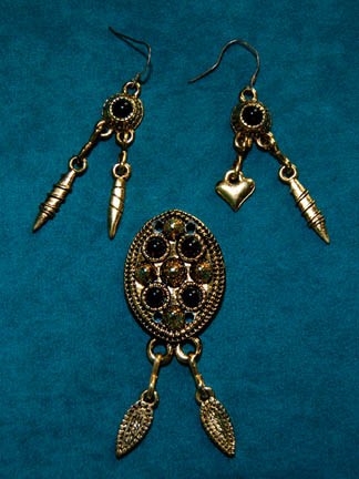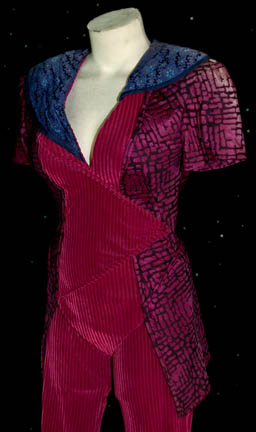 Description: A costume featured in the Star Trek: Deep Space Nine episode “The Ship”, wherein “Captain Sisko” (Avery Brooks) fights a group of Jem'Hadar to keep the wreckage of a crashed Dominion ship after the crew still on his ship are killed save only a few. The costume is for wear by Kaitlin Tompkins in the role of the Vorta in charge of the Jem’Hadar,“Kilana”, and is a cranberry colored blouse and skirt with a corduroy design on the abdomen, an uneven, pleated, floral pattern in several shades of blue on the collar, a purple and black brickwork pattern of randomly shaped/sized objects along the shoulders and down the sides, a faux jewel where the corduroy portions overlaps on the purple/black, a pair of trousers that correspond in style and color to the corduroy portion of the blouse, stirrups for the feet, and a pair of gold colored metal earrings. There is light wear on the shoulders due to time and storage. A sewn in tag reads ‘Deep Space Nine, Kaitlin Hopkins’ and the costumer’s tag reads ‘Ds9, Kilana (Vorta), Kaitlin Hopkins’.