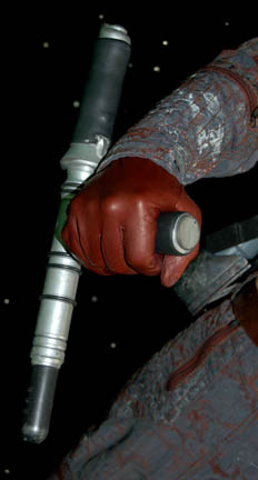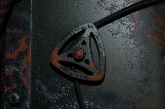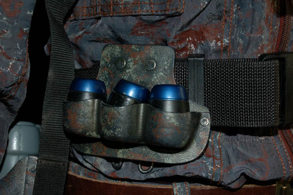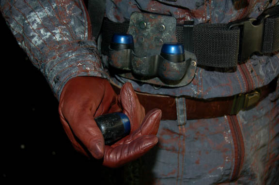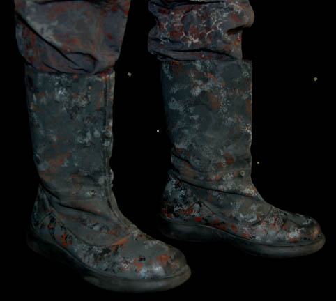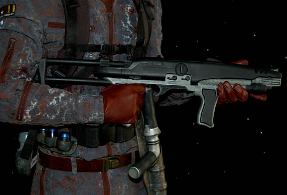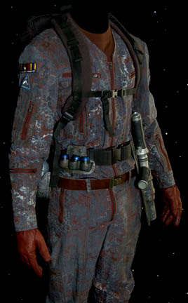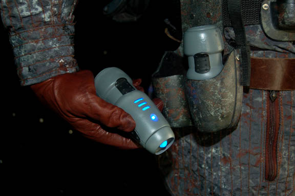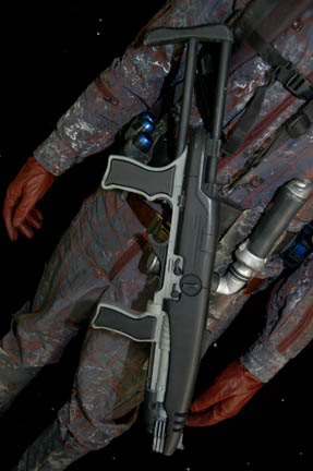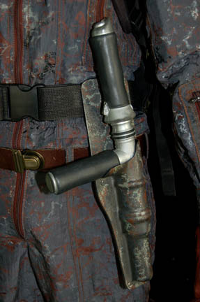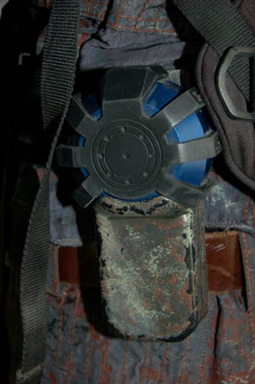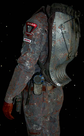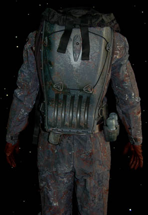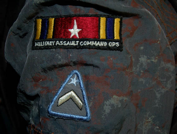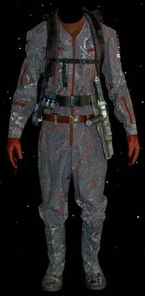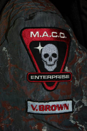 Description: A complete MACO (Military Assault Command Operations) uniform and equipment featured in various episodes of Star Trek: Enterprise, but configured for appearing in the episodes “In a Mirror, Darkly, Parts I and II”. The costume is ‘space camouflage' colored trousers with a matching uniform jacket, both with multiples zippered pockets and size adjustments, and matching boots. The jacket is adorned with a skull emblazoned shoulder patch indicative of the Terran Empire MACOs, and a name patch reading ‘V. Brown’, while the right sleeve features a patch indicating the wearer to be a ‘private’ and a department strip reading ‘Military Assault Command Ops.’. The costume also features a brown undershirt and a brown leather belt and gloves. The MACO belt is black nylon with a plastic clasp buckle, and features a blue hand scanner in its holster, a molded rubber stun baton painted metallic silver with black rubber grips and is carried on a vacuum formed holster, a pair of grenades, one molded rubber and another with a working blue light activated by a depression button on the reverse, both inside a formed open topped pouch, and a trio of metallic blue painted pistol cartridges. The kit also comes with a MACO style backpack and an energy carbine with a black nylon shoulder strap. The reverse of the grenade pouch is adorned with a strip of adhesive tape inscribed ‘Dominic’ indicating likely use by Dominic Keating in his portrayal of “Major Malcolm Reed”, the uniform is accompanied by a costumer’s tag indicating use by various actors, none of which were Dominic Keating.