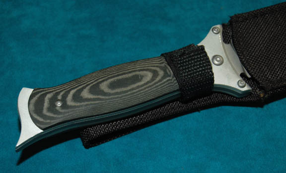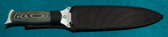 Description: A metal double sided dagger with a black stained wood grip and a black nylon sheathe featured in the Star Trek: Enterprise episodes “In a Mirror, Darkly, Parts I and II” for use by Terran Empire Starfleet characters in the mirror universe. The blade of the knife is beveled to appear sharp and features a series of cut-outs down the center divider. The sheathe is made to be worn on a belt with a sewn on loop. The knife in the sheathe measures approx. 13.25 X 2.25 inches.