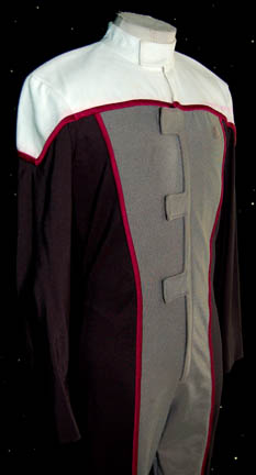 Description: In the Star Trek: Voyager episode “Drive”, “Tom Paris” (Robert Duncan McNeill) and “Harry Kim” (Garrett Wang) entered an Antarian Trans-stellar Rally in the new “Delta Flyer” space craft. This is Harry's racing jumpsuit that has white shoulders with a black and gray body and crimson trim. There is a zip up the front and Velcro tabs to cover it. Due to time and use, there is some color bleeding from the crimson trim onto the white shoulders. The sewn in tag reads “Voyager – Garrett Wang”. Costume comes complete with costume tag.