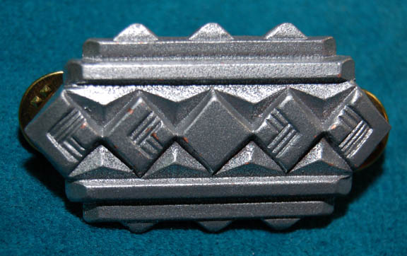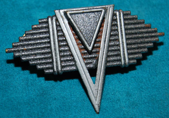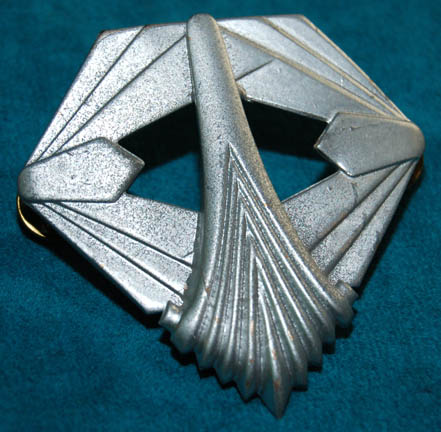 Description: A set of silver colored metal Terran Empire uniform badges featured in the Star Trek: Enterprise episodes “In a Mirror, Darkly, Parts I and II” for wear by high ranking Starfleet officers like “Captain Maxmilian Forrest” (Vaughn Armstrong), “Commander Archer” (Scott Bakula), and admirals “Black” (Gregory Itzin) and “Gardner” (John Mahon). The badges are pin backed and feature geometric, almost Art Deco style shapes and arrangements. They measure approx. 2.5 X 2.5, 2.5 X 1.5, and 1.75 X 1 inches respectively as they are depicted from top to bottom.