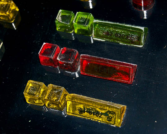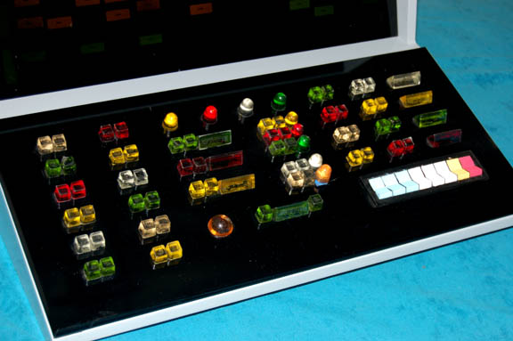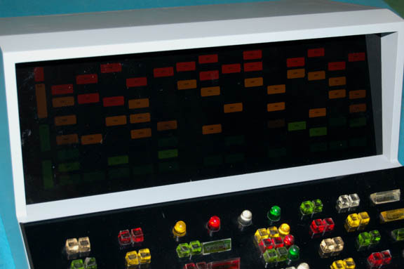 Description: A prop computer console featured in the Star Trek: Enterprise episodes “In a Mirror, Darkly, Parts I and II” in sets depicting the “Starship Defiant”. The console is made of a wood housing with a smoked acrylic ‘display screen' and a similarly constructed button board that features affixed ‘jewel’ style buttons and a row of fixed position multi-colored switches. The console lights when plugged into a standard American 120volt outlet via a cable and a two prong plug. The item measures approx. 22 X 21 X 23.5 inches.