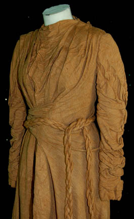 Description: This costume was featured in the Star Trek: Voyager episode “Sacred Ground”. It has a tan tunic with ruffled sleeves, pleats up the front and back and an attached sash that snaps at the side. Matching tan trousers accompany the tunic, as does a braided belt with tassels. Costume comes complete with costume tag.