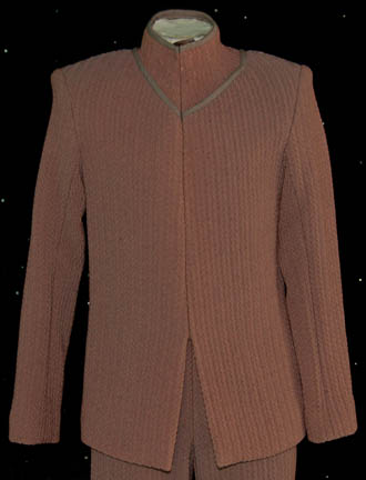 Description: A costume featured in the Star Trek: Voyager episode “Natural Law”, wherein “Commander Chakotay” (Robert Beltran) and “Seven of Nine” (Jeri Ryan) are trapped on a primitive part of the planet Ledos and “Tom Paris” is forced to take piloting lessons. This costume is for wear by Neil Vipond in the role of the flight instructor “Kleg”, that is to give “Tom Paris” his lessons, and is a long-sleeved, brown jacket with a textured arrow pattern, lighter brown colored accents around the neck, satin lining, a zip up the front, corresponding overall style trousers of the same style, and stirrups for the feet. A sewn in tag reads ‘Voyager, Neil Vipond' and the costumer’s tag reads ‘268 Natural Law, Kleg - Ledosian, Neil Vipond’.