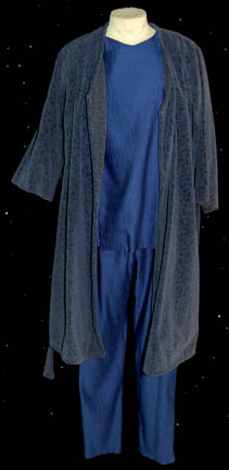 Description: A costume featured in various episodes of Star Trek: Voyager, by Robert Picardo in the role of the starship “Voyager's” Emergency Medical Hologram named simply, “The Doctor” and is a long-sleeved, blue pajama shirt in a wrinkly fabric style, corresponding trousers, and a full-length, long-sleeved, dark blue robe with a textured pattern that almost resembles some kind of hieroglyphics. The second pair of pajamas are for wear by J. R. Quinonez; the stand in for Robert Picardo, and later “Dr. Phlox” (John Billingsley) on Star Trek: Enterprise. A sewn in tag in the first pair read ‘Voyager, Robert Picardo’ and in the second, ‘Voyager, J. R. Quinonez’