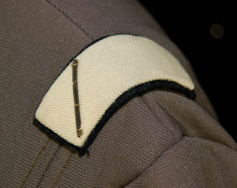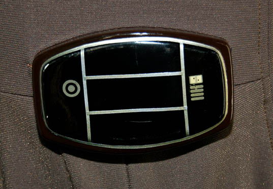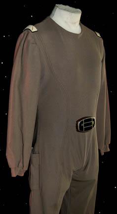 Description: A costume featured in Star Trek I: The Motion Picture for wear by Starfleet personnel. The costume is a grey colored full length jumpsuit with an attached plastic bio-monitor and affixed command white division strips on the shoulders with a thin embroidered gold strip on each indicating rank. Evidence of fading is present along the seams and outside of the sleeves due to time or storage conditions.