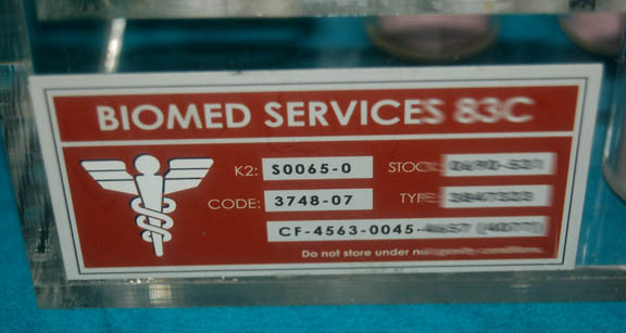 Description: This Starfleet medical box was used during the filming of Star Trek: Enterprise and was most likely featured in Dr. Phlox's sickbay onboard the U.S.S. Enterprise NX-01. The clear acrylic container has a sliding lid and Starfleet medical labels on the sides that read “Biomed Services 83C”. Inside are seven acrylic tubes, each with medical labels on the sides and rolled up pink paper inside to create a ‘filled’ effect. Six of them also have silver colored resin tops. The container measures approx. 9 ½ x 4 ½ x 3 ½ inches.