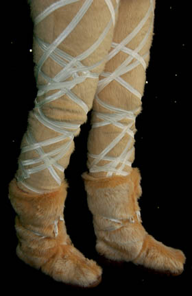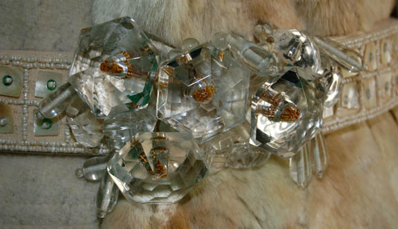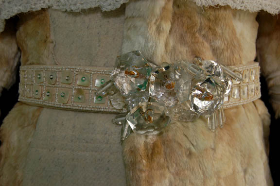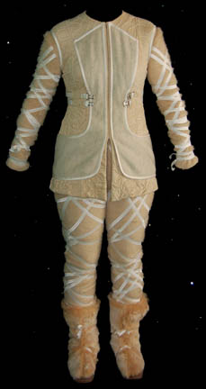 Description: The “Aenar” are a blind humanoid race with highly advanced telepathic abilities and a subspecies of the better known “Andorians”. They were featured in the Star Trek: Enterprise episode “The Aenar” where they were visited in their icy home world by “Captain Archer” (Scott Bakula) to find out if they had any link to the marauders destroying ships in the area. This Aenar costume includes a soft cream imitation fur jumpsuit that has white ribbons wrapped around the arms and legs. Over the jumpsuit is a corresponding cream vest. The long double breasted coat is also imitation fur and has white ribbons criss-crossed down each sleeve. A beautiful belt accompanies the costume with faux gems, beads, sequins and real mother of pearl pieces that has leather ties at the back. There is also a white lace shoulder wrap and fur boots. Costume comes complete with costume tag.