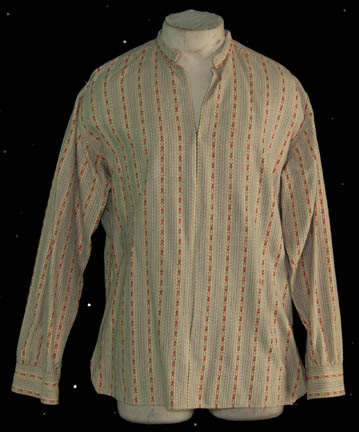 Description: A lot of costume aspects for use in various episodes of Star Trek: Voyager, for wear by Robert Beltran in the role of the former Maquis leader and First Officer of the starship Voyager “Commander Chakotay”. The articles are a long-sleeved rust colored shirt with white suns and circles, and a zip down the front; a long-sleeved, off-white shirt, southwestern design, blue and red stripes, and a zip down the front; a vest with red and white diamond patterns, leather accents, and brown trousers. A sewn in tag reads ‘Voyager, Robert Beltran'.
