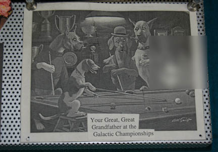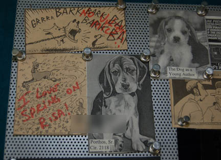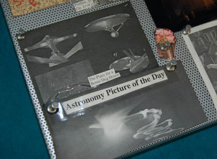 Description: This interesting piece is a bulletin board made for “Captain Archer's” (Scott Bakula) dog “Porthos” for the Star Trek: Enterprise series. It is uncertain whether this piece actually made it on screen however its charm is unmistakable! The metal frame has newspaper clips and scanned images of references to dogs and Star Trek. Quirky jokes are incorporated into the design including a picture of the original Enterprise with a caption on the bottom that reads “The Plans for a Better Dog House”. There is also a photo of “Stage 18”, presumably on the Paramount lot where Star Trek was filmed. Metal tags hold the pictures in place. Measures approx. 12 x 12 inches.