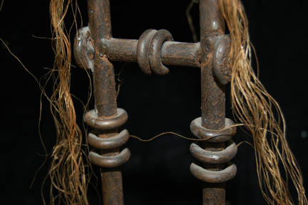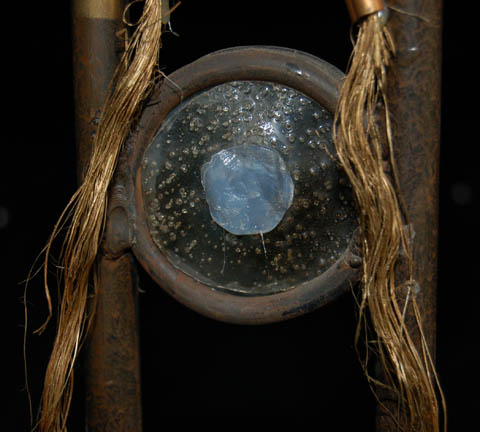 Description: A wedding decoration from “T'Pol’s” (Jolene Blalock) Vulcan childhood home courtyard and featured in the Star Trek: Enterprise episode “Home” in which “T’Pol” engages in an arranged marriage ceremony with her childhood fiancé “Koss” (Michael Burke). The decoration includes a metal base with a resin block inside it and a metal decorative frame. A piece of clear circular acrylic is in the center with two strands of hair like twine hanging down from the top. The circular disk at the top is for a candle (not included) to be attached. Measures approx. 21½ x 5¾ x 5¾ inches.