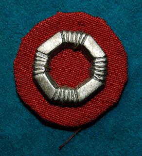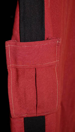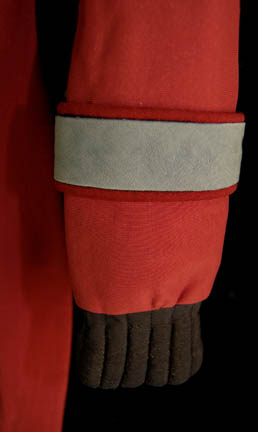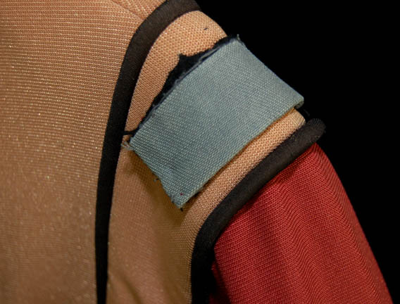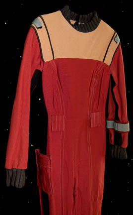 Description: A costume featured in various Star Trek feature films for wear by character in Starfleet at crewman ranked positions. The costume is a full length red jumpsuit with tan shoulders and chest, black piping, a black ribbed collar and cuffs indicating the wearer to be a crewman and not a trainee, and affixed gray division strips on the shoulders and on the left sleeve indicating the wearer to be part of the science division. The item also comes with an unattached red placement with an affixed silver colored metal badge indicating the wearer to be the rank of ‘petty officer first class'.
