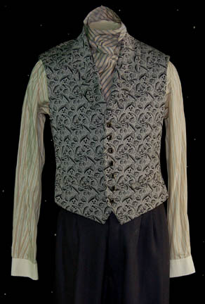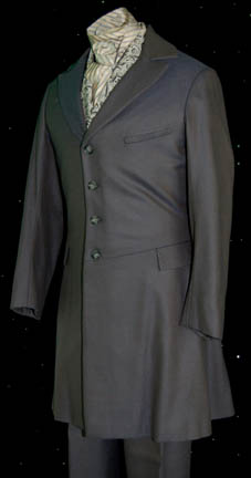 Description: A costume featured in Star Trek: Voyager episode, “Cathexis”, wherein “Commander Chakotay” (Robert Beltran) is drained of all neural energy and lays brain dead in sickbay. The costume is for wear by Michael Cumpsty in the role of Lord Burleigh, a character from one of “Captain Janeway's” (Kate Mulgrew) holodeck programs in which she plays Governess to the Lord’s children, and is a long-sleeved, white, pleated dress shirt featuring brown and tan stripes, buttons halfway down the pleats, larger button in collars to tie on two gray/blue striped cravats, a corresponding gray vest with a black, intricately embroidered floral pattern, and satin lining; a bluish gray, long-sleeved, suit coat with traces of red and green in the stitch, four-button cuffs, corresponding trousers, and stirrups for the feet. A sewn in tag reads ‘Voyager, Michael Cumpsty’ and the costumer’s tag reads ‘107 Eye of the Needle, Lord Burleigh, Michael Cumpsty’. The costumer’s tag states the costume is from “Eye of the Needle” when “Memory Alpha” and “Trekcore.com” reveal it as a mistake and that it is actually from “Cathexis” and appears again in “Persistence of Vision”.