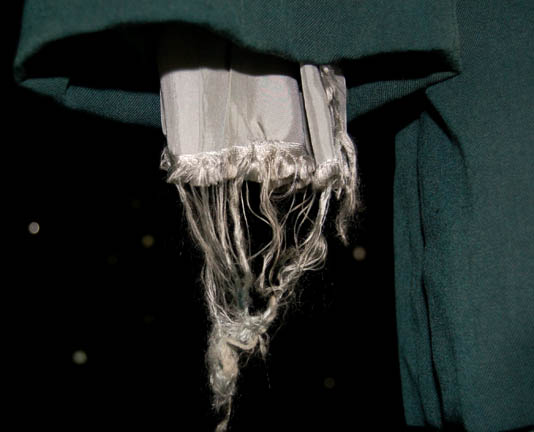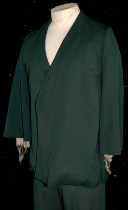 Description: A costume made for in Star Trek IV: The Voyage Home listed as a ‘Federation Worker' in the ‘Federation Security Council Corridor’. The costume is a dark green wrap with cropped sleeves and matching trousers. The sleeves interior lining have frayed, but the double breasted wrap seals with a Velcro placement at the waist and features an internal tie. The item features a sewn in Western Costume Co. tag with no name.