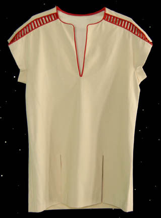 Description: A costume featured in Star Trek II: The Wrath of Khan for wear by characters on the ‘Regula I' space laboratory. The costume is a sleeveless shirt with red lining around the neck and keeping together the separates of the chest and shoulders. The costume also has two slits up the waist of the front.