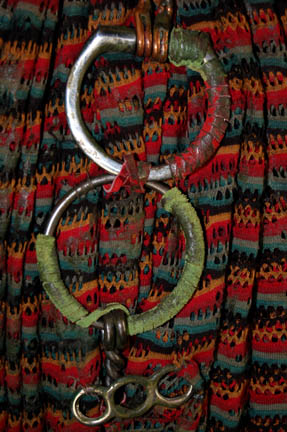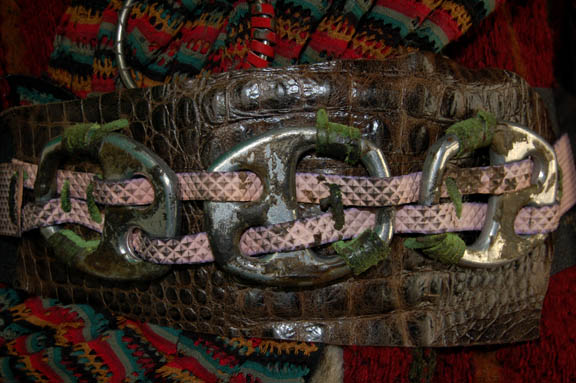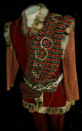 Description: A costume featured in the Star Trek: Voyager episode “State of Flux”, wherein the “Voyager” crew discovers that someone on board is secretly leaking information to the Kazon. The costume is for wear by Anthony De Longis in the role of the First Maje of the Kazon-Nistrim and the party to whom the mysterious “Voyager” crewmember is sending information, “Jal Culluh”, and is long-sleeved, rust colored leather jacket featuring multicolored crisscross threading, and clasps up the front; a maroon, woven vest with olive and tan stripes, fur accents, and clasps up the front as well, a woven sash corresponding to the colors of the vest, various metal rings on a chain to denote rank, and a wide vinyl belt with more metal rings attached by leather string and another belt looping through the rings. A sewn in tag reads ‘Voyager, Anthony De Longis' and the costumer’s tag reads ‘111 State of Flux, Kazon Capt. Culluh, Anthony De Longis’.