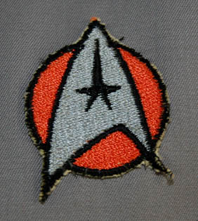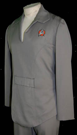 Description: A costume featured in Star Trek I: The Motion Picture for wear by crewmen aboard the “USS Enterprise”. The costume is a gray colored Class-A Starfleet uniform with a collared uniform top, an affixed orange backed Starfleet logo patch indicating the wearer to be part of the sciences division, matching trousers, and an unattached bio-monitor.