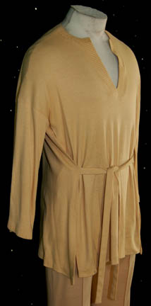 Description: A costume featured in Star Trek I: The Motion Picture for wear by Starfleet characters in off duty situations. The costume is tan colored trousers and a matching top with cropped sleeves and a waist tie with a crimped neck. A degree of staining is evident along the waist of the shirt.