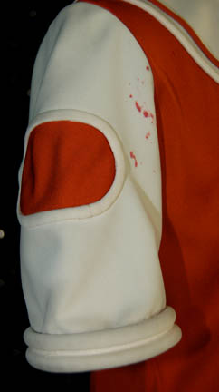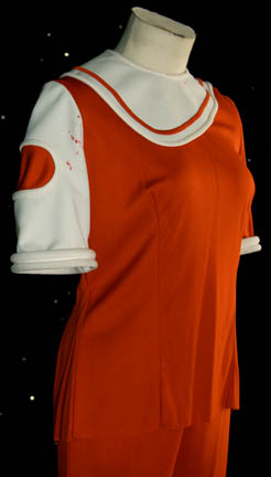 Description: A costume featured in Star Trek II: The Wrath of Khan for wear by a female Regula I researcher. The costume is brown trousers with a matching top that features a white sleeve and white accent around the collar and dried special effects ‘blood stains' spattered on the white sleeve. The costumer’s tag reads ‘Star Trek II, Diane Carter as Lab Scientist, Chg. #1’.