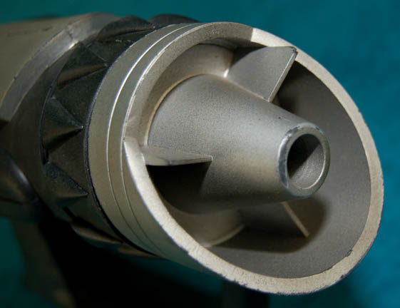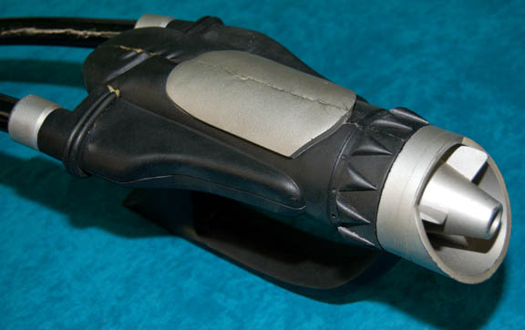 Description: A hand prop firearm featured in Star Trek IX: Insurrection for use by character portraying the villainous Son'a aliens. The item is a black foam rubber weapon with metallic silver components and a molded rubber arm brace. The item measures approx. 28 X 5.5 X 7 inches.
