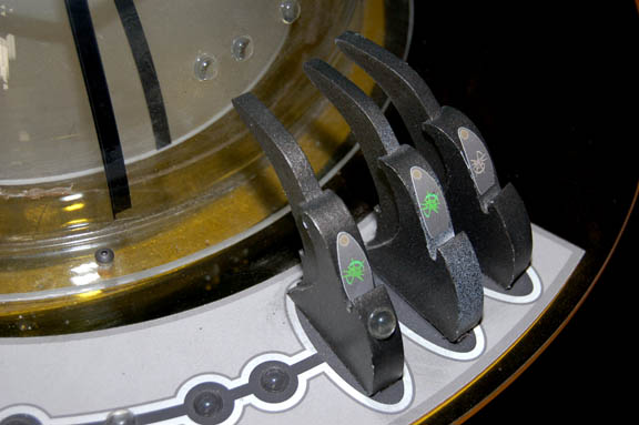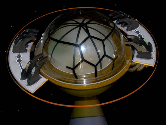 Description: The Xindi-Insectoids are a member of the multi-species Xindi race and are distinctly insect like in appearance. They align themselves most readily with the aggressive Xindi-Reptilians and trade their technology knowledge with them. This is a Xindi-Insectoid console featured during the Star Trek: Enterprise series. The console has a particle board and metal cylindrical frame painted gray with lighter gray accents. The dome top has a clear yellow acrylic ring with resin components set around the rim to simulate controls. A smoked acrylic dome rests inside a clear outer dome. Both domes have black applications applied for detail. The console is designed to function on a standard U.S.A. 120V Type A two-pronged plug, lighting up the center dome, however it does not currently appear to work. One screw is missing from the out dome that does not affect the appearance of the piece. On the base it reads “67 ENT, Xindi Insectoid Console”, inscribed on the base in silver marker. Measures approx. 40 x 20 inches diameter.