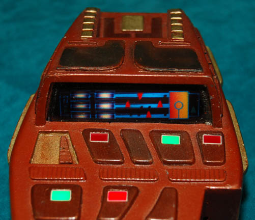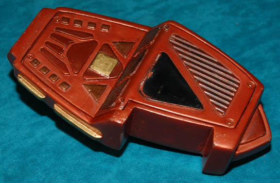Description: The Klingons are a humanoid warrior civilization originally from the planet Qo'noS but now a strong and revered interstellar military power seen throughout the Star Trek anthology. This is a Klingon device in the 22nd Century style and presumably used on the Star Trek: Enterprise series. It is made of resin painted copper color with gold and black colored accents. A black button on the top activates a small blue strobe light on the front of the device, backlights a small gauge panel and activates five LED lights. Three lights are red, two are green. Two of the red lights flash intermittently. The device is powered by a single 9V battery (not included) that is accessed by removing the six Philips head screws and taking off the back panel. Measures approx. 6 x 3 ½ x 2 inches.