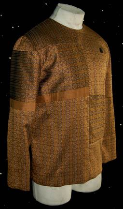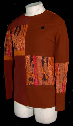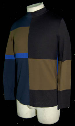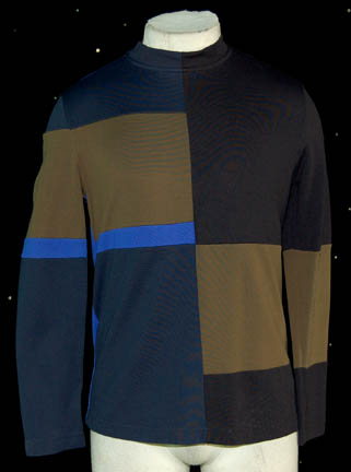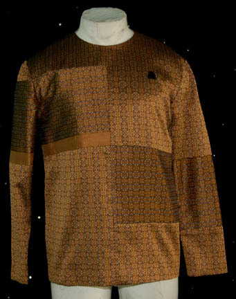 Description: A costume lot worn in various episodes of Star Trek: Voyager by Manu Intiraymi in the role of the former Borg drone “Icheb”. The articles are two identical long-sleeved, rust colored shirts with panels of multicolored stripes in a reflective, textured design, a Velcro patch for a combadge (not included), and a zip down the back; a gold colored, long-sleeved shirt featuring a complex hexagonal pattern in lighter and darker shades, mustard colored accents, a Velcro patch for a combadge (not included), a zip up the back, and a blue, long-sleeved shirt with several different colored panels. A sewn in tag reads ‘Voyager Manu Intiraymi'.