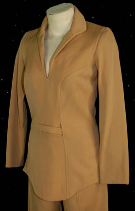 Description: A costume featured in Star Trek I: The Motion Picture for wear by Grace Lee Whitney in her portrayal of “Janice Rand”. The costume is a Class-A collared Starfleet uniform with long sleeves and matching trousers. The costume comes with an unattached plastic bio-monitor and the uniform top features a sewn in Western Costume Co. tag reading ‘Grace Whitney'. The trousers have no name tag. A costumer’s tag is present that reads ‘Grace Whitney, Not Used’.