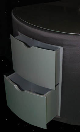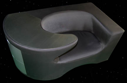 Description: An impressive Ready Room couch that was featured in multiple Star Trek: Enterprise episodes and in the style that appeared in “Captain Archer's” (Scott Bakula) Ready Room. The couch is padded gray fabric with a swooping built in desk. The desk portion has a metal top with a few scratches due to time and use and there are two drawers on the right side. There is a small stain on the left armrest and a larger stain on the front. For convenience the couch is on wheels for ease of positioning. Measures approx. 62 x 35 x 29 inches.