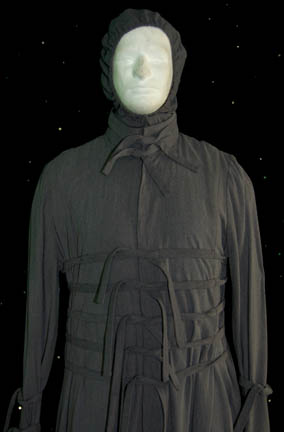 Description: A costume featured in the Star Trek: Voyager episode “Someone to Watch Over Me”, wherein “Voyager” was engaging in a cultural information exchange with a strictly regimented people known as the Kadi. This costume is for wear by Ian Abercrombie in the role of the Kadi official assigned to choose an ambassador for the exchange, “Abbot”, and is a long-sleeved, full-length, blue-gray, robe with two ties on the collar, five on the abdomen, and snaps down the front; a hood that tucks into the collar, a three-pronged metal pin that attaches over the first tie on the abdomen, a tie on each arm, and corresponding overall style trousers. Ian Abercrombie is perhaps best known in the role of the “Wise Man” from the cult favorite “Army of Darkness”. A sewn in tag incorrectly reads ‘Deep Space Nine, Ian Abercrombie' when it was actually Voyager and the costumer’s tag reads ‘216 Someone to Watch Over Me, Abbot, Ian Abercrombie’.