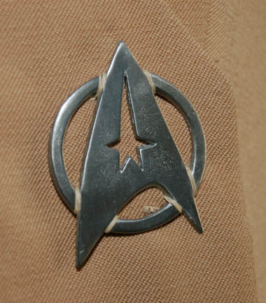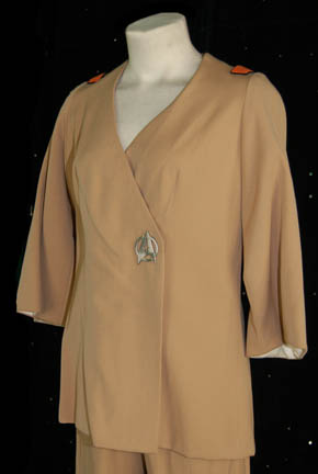 Description: A costume featured in Star Trek I: The Motion Picture for wear by Nichelle Nichols in her portrayal of “Uhura”. The costume is a tan colored Class-C jacket wrap Starfleet uniform with matching trousers. The wrap features a cropped sleeves and a metallic pewter colored metal Starfleet emblem affixed at the waist and affixed orange colored division strips on the shoulders. The sewn in Paramount tag in the jacket reads ‘Nichelle Nichols' while the one in the trousers is inscribed ‘N N’. A costumer’s tag reads ‘N. Nichols, Not Used’.