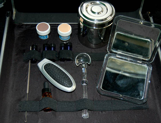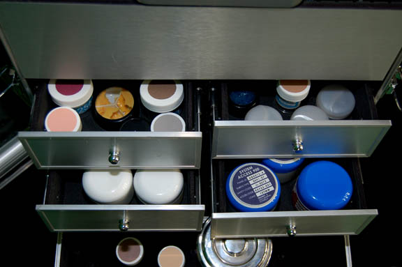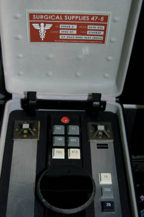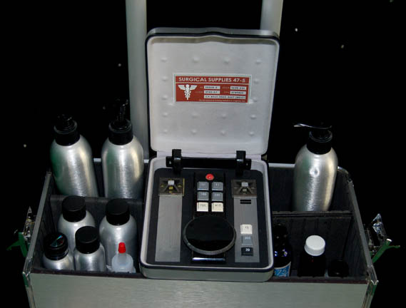 Description: “Dr. Phlox” (John Billingsley) of the Denobulan race joined the NX-01 Enterprise from earth where he was part of the Interspecies Medical Exchange. This impressive Away Team kit was made for use by Dr.Phlox during the Star Trek: Enterprise series. The metal rolling case has a removable top to reveal a trio of size adjustable compartments; the lid fastens with two latches on either side of the container's exterior. The front of the container opens out on hinges on the bottom to reveal four approx. 6 X 3 X 6.5 inches drawers that each contains several items apiece. Under the drawers there is another compartment that measures approx.14 X 7 X 5.5 inches with its own goodies. The contents of the case include three aluminum pump dispensers with black plastic screw on pumps, a blue glass container with a black plastic screw on lid with affixed blue sickbay label, a rectangular metallic silver case with a ‘surgical services’ label on the outside; the item opens up to reveal a black foam core interior with metallic and resin details attached as well as ‘buttons’ on the inside. There are various 1-8oz containers and vials that are empty or actually contain undisclosed kinds of fluids, gels, jellies, lotions, wax-like substances, etc.; some of which may include iodine and Vaseline. The entire kit measures approx. 21.25 X 10.25 X 16 inches. It features externally a handle on the lid and another that telescopes from the top. Please note that any remaining substances are not for use and are for display only.