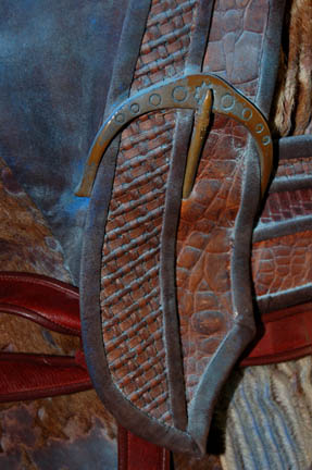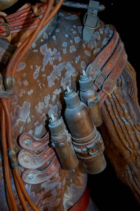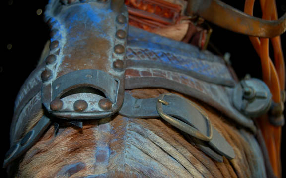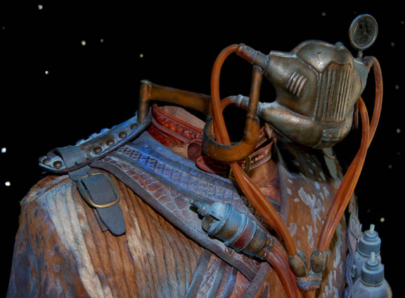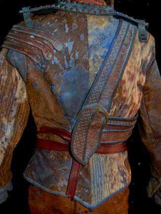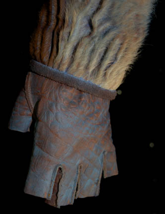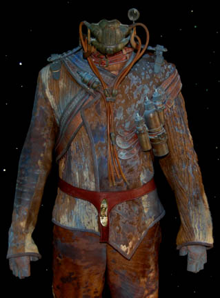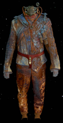 Description: This impressive costume was made for use by the “Alien Foreman” (Stephen McHattie) in the Star Trek: Enterprise episode “The Xindi”. The foreman ran a trillium mine and had to use an inhaler to breath since his lungs were destroyed by the toxic fumes from the mines. “Captain Archer” (Scott Bakula) was searching for a Xindi believed to be in the mine however the foreman refused without half a liter of platinum in return. His costume includes a sleeveless jumpsuit made of brown leather and fur with a fabric top section and an attached fur dickie. Parts of the leather are dyed blue. The collar has two straps with buckles to go around the neck. The jacket is made of ribbed fur and leather also with parts of the leather dyed blue. Attached to the jacket are leather straps and buckles. Three metal bottles painted to match the rest of the costume are on the front with tubes that connect with a faux valve. The valve has a tube that connects to a faux breathing mask and monocle. The breathing apparatus attaches the jacket with snaps on the shoulders. The costume is complete with a leather belt and corresponding fingerless gloves. Costume comes complete with costume tag.