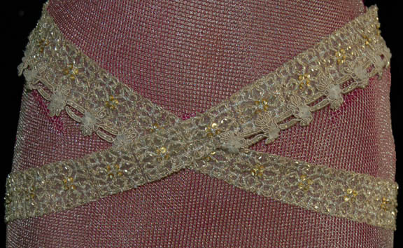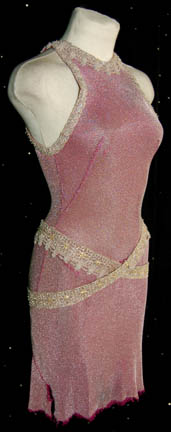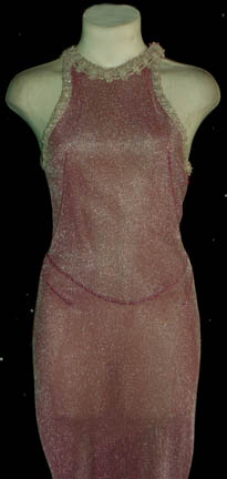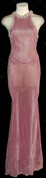 Description: “Kaitaama” (Padma Lakshmi) was a Kriosian princess from Krios Prime who was kidnapped by two Retellians in the Star Trek: Enterprise episode “Precious Cargo”. When the Retellians had ship failure they contacted the U.S.S. Enterprise for assistance where “Trip Tucker” (Connor Trinneer) noticed their royal cargo with bound hands and rescued her. Her costume lot includes two short dresses and one full length dress, all made of the same magenta and silver mesh fabric. Each dress has detailed cream lace and beaded detail around the neckline and arm holes. The short dresses also have attached corresponding belt ties. Costumes comes complete with costume tag.