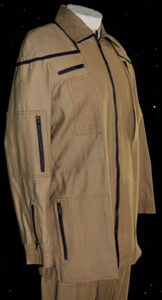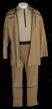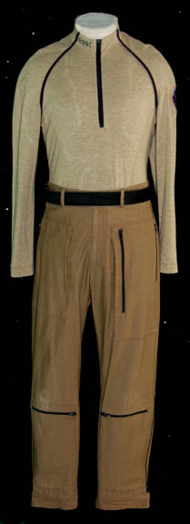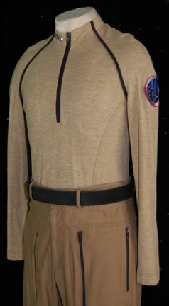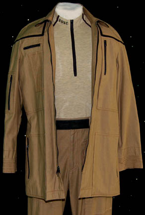 Description: This amazing “Captain Archer” (Scott Bakula) desert Starfleet uniform was made for wear in the Star Trek: Enterprise episode “Desert Crossing” in which Archer and “Trip” (Connor Trinneer) were invited to a desert planet after they helped fix an alien leader's ship. They soon discovered they were there under false pretenses and had to make their escape across the desert. The tan color shirt has black trim and a black zip up the front. On the left shoulder is a famous NX-01 Enterprise patch and attached to the left side of the collar are four captain’s rank pips. The sewn in tag reads “Enterprise - Scott Bakula, Wade Kelly”, indicating this costume was likely reused by a secondary actor or stuntman. The accompanying kaki trousers have multiple pockets and come with a black suede belt. The sewn in tag reads “Enterprise – Scott Bakula, Wade Kelly, Vince Deadrick” indicating the trousers were made for both the lead actor and his stunt doubles. The accompanying costume tag with the trousers and belt read “Archer Stunt Dbl”. The corresponding jacket was made for wear with the desert uniform and is the same kaki color as the trousers with black trim around the shoulders and multiple zippered pockets. The sewn in costume tag reads “Enterprise – Scott Backula”. The accompanying costume tag for the jacket reads “Archer, Scott Bakula – Desert jacket”.