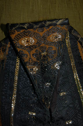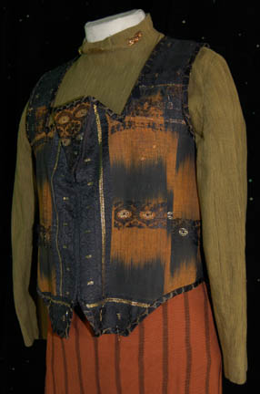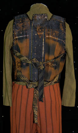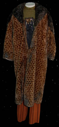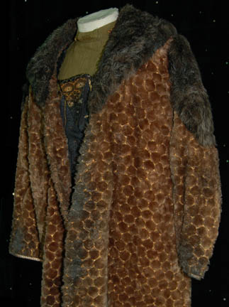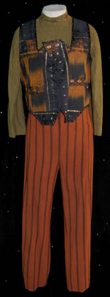 Description: A costume featured in the pilot of Star Trek: Voyager, “Caretaker”, wherein “Voyager” and a Maquis ship are pulled into the Delta Quadrant by en entity known as “The Caretaker”. This is the costume that “Neelix” (Ethan Phillips) is wearing when the “Voyager” crew encounters him for the very first time and is a long-sleeved, olive colored shirt with copper colored, arrow-shaped pins, and a gold colored spiral pin on the collar, a zip down the front, a black and brown vest, gold accents, multiple patterns, and textures, a zip and Velcro down the front, coiled, gold colored/black striped ties in the back, and rust colored/black striped trousers; a long-sleeved, brown fur coat with a gold hexagonal design sewn on top of the fur, darker fur along the collar and shoulders, reflective brown piping along the cuffs, and light green, ankle-length leather shoes . The vest and the coat were distressed for effect; the vest had some of its material frayed and the coat had some of the fur mottled and stiffened. A sewn in tag reads ‘Voyager, Ethan Phillips' and the costumer’s tag reads ‘John Phillips, Neelix, Voyager, Pilot’.