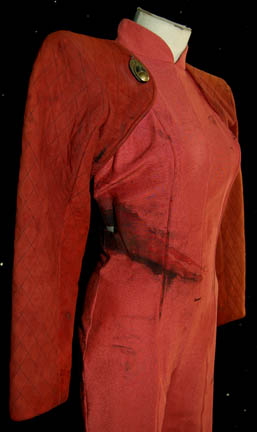 Description: “Kira Nerys” (Nana Visitor) was a Bajoran female who was a Colonel in the Bajoran Militia and later a Bajoran liaison officer on Deep Space Nine. This distressed uniform was made for wear by Kira in the Star Trek: Deep Space Nine episode “Defiant” in which she was phasered by a person claiming to be “Commander Wil Riker” (Jonathan Frakes). The costume was located with other costumes from the “Defiant” episode. The Bajoran uniform is a rose color jumpsuit with suede rust color shoulders and sleeves. The suede is stitched with black thread in a diamond motif. The jumpsuit has a zip up the back and is distressed with a hole in the left side and faux blood to signify an injury. Attached to the right side of the chest is a cast resin distressed Bajoran emblem. The sewn in tag reads, “Deep Space Nine – Nana Visitor”.
