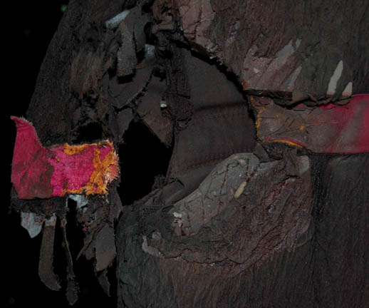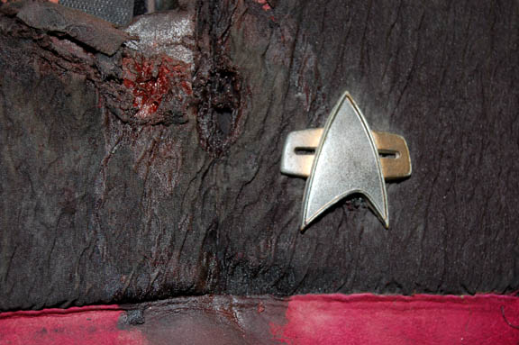 Description: This distressed Command Division Starfleet Guard vest was featured in the Star Trek: Deep Space Nine episode “Nor the Battle to the Strong in which a Federation colony was attacked by Klingons. The black sleeveless vest is padded with Velcro up the back and up each side. A Command Red leather band runs around the torso. Both shoulders appear shredded to indicate battle wounds. Attached with Velcro to the left side of the chest is a slightly distressed Combadge made of resin.