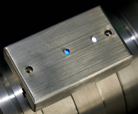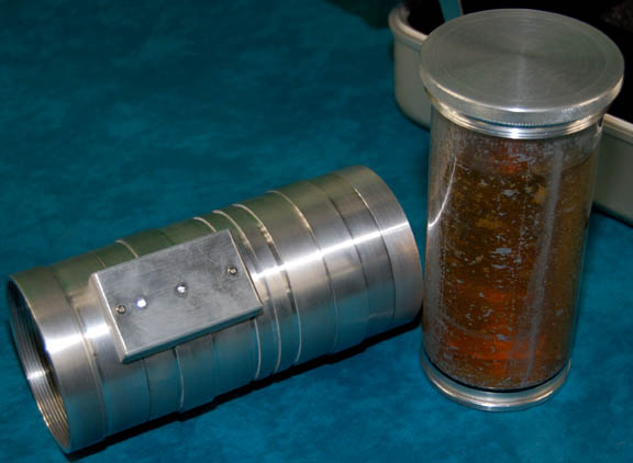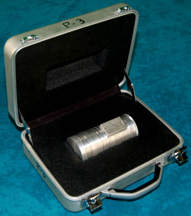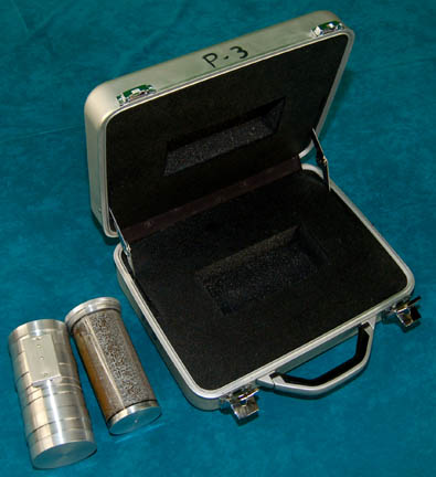 Description: A prop item and its corresponding case featured in the Star Trek: Enterprise episode “The Xindi”. The item is a silver colored metal case with a foam interior made to fit specifically the aluminum tube prop inside. The case features to powerful metal latches and a sturdy handle, the lid opens on two arms that keep it open. The item inside is the prop ‘liquefied platinum' payoff required by the “Mine Operator” (Stephen McHattie) before an audience would be arranged for “Captain Archer” (Scott Bakula) and his away team to meet a Xindi mine worker. The item is a silver aluminum cylinder which features an affixed box with both a static and a blinking light activated by a small switch on the bottom of the box, powered by two AAAA sized batteries. When the top is unscrewed from the battery box component a clear plastic container with another aluminum end can be pulled away inside which is an unknown liquid substance with a hardened mixture meant to appear as “platinum, in its liquefied state”. Screwed together the components measure approx. 7 X 3.25 inches diameter and the case measures approx. 14.5 X 11.5 X 5 inches.