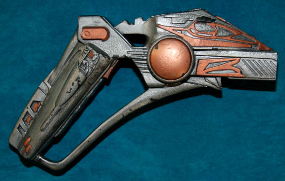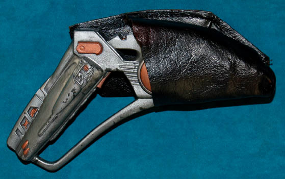 Description: A prop energy pistol and accompanying holster featured variously through Star Trek episodic television for use by alien characters. Hand guns like this appeared in the Star Trek: Enterprise episode “Kir'Shara” in the hands of a Vulcan soldier at Vulcan High Command, and in the hands of an alien scavenger in the Star Trek: Voyager episode “Imperfection”. The item is a gray painted molded resin hand gun with metallic copper painted details with an accompanying black leather holster featuring an affixed ‘Binachi International Universal Military Holster’ clasp. Together the items measure approx. 10.75 X 7 X 3 inches.