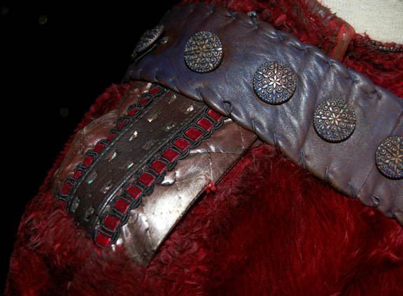 Description: A costume featured in the Star Trek: Enterprise episode “Acquisition”, wherein a group of interstellar thieves, who are obviously Ferengi but are never actually named as thus, incapacitate the crew and begin looting the “Enterprise NX-01”. This costume Is for wear by veteran cult actor Clint Howard in the role of one of the “thieves”, “Muk” and is a sleeveless, full-length jumpsuit in a spandex-type material, plastic button and alligator skin print, maroon vinyl accents along the inside of the legs; a long-sleeved, jacket with maroon fur, wool accents down the front, vinyl epaulettes, and cuff accents, further maroon piping, a zip that tucks into the jumpsuit, matching vinyl gloves, and purple striped socks. Also included is a wide leather belt with beaten metal shapes tied to the belt with more leather string, two vinyl belts that go across the chest as a bandolier; one with intricately carved buttons and the other copper colored rings that are bent on the ends. Clint Howard is the older brother of Ron Howard. A sewn in tag reads ‘Enterprise, Clint Howard, 019' and the costumer’s tag reads ‘Enterprise 019 Acquisition, Muk, Clint Howard’.