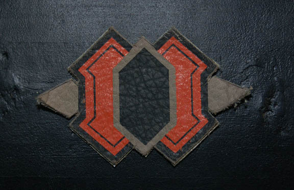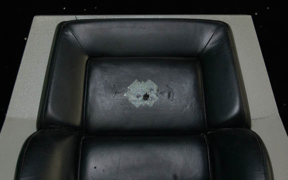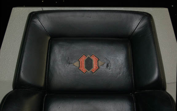 Description: This distinctly Klingon chair was presumably used as set dressing during the Star Trek: Deep Space Nine series. It is made of wood painted gray, teal and black with a black leather padded seat. A non-Klingon patch was attached to the headrest however is has now come off. Due to time and use the paint is chipping in certain places. The head board is cracked and moves but slots back into place. It would need to be glued for long term use. “#216 2 of 2” is written on the base. Measures approx. 35 x 34 x 39 ½ inches.