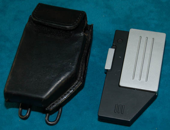 Description: An Art Asylum LLC detailed replica Starfleet communicator featured in various episodes of Star Trek: Enterprise acquired by the production for on screen use. The item is black with metallic silver paint, features a working hinge, and a button that when depressed flips open the item to reveal accents and a screen with a power meter and signal strength gage that is illuminated blue for approx. 6 seconds. The item is accompanied by a custom made black leather pouch with a Velcro seal flap. The pouch attaches to a uniform through the use of a ‘Bianchi International Universal Military Holster' clip and measures 4.25 X 1.75 X 2.5 inches in the holster.