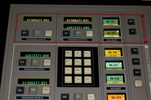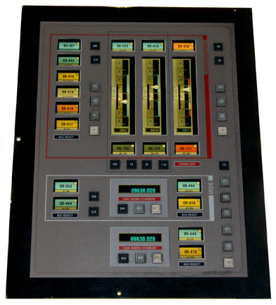 Description: A pair of smoked acrylic computer interface panels painstakingly removed from set pieces and wall flats created for sets making up the “Enterprise NX-01” on Star Trek: Enterprise. The items both feature graphical applications on their fronts with multiple multi-colored faux rubber buttons in varying configurations. The graphics depict a variety of gages and indicator lights which appear when backlit. One panel indicates that it handles ‘launch support' while the other deals with ‘consumable status’ and ATM recharge’. The items measure approx. 18 X 14 inches.