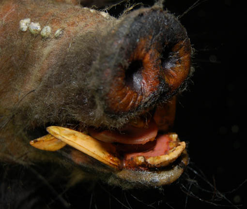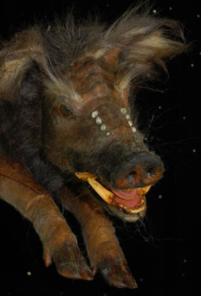 Description: A foam rubber Klingon ‘Targ' prop featured in the Star Trek: Enterprise episode “Sleeping Dogs” appearing during scenes where an away team from the “Enterprise NX-01” board a seemingly derelict Klingon starship and investigate the galley. The targ hung from bound hind feet molded into position to appear hanging with its head attached via internal cable. The item is painted to appear real, has implanted fur, tusks, teeth and eyes, a tail, and hooves. The item measures approx. 52 X 16 X 9 inches.