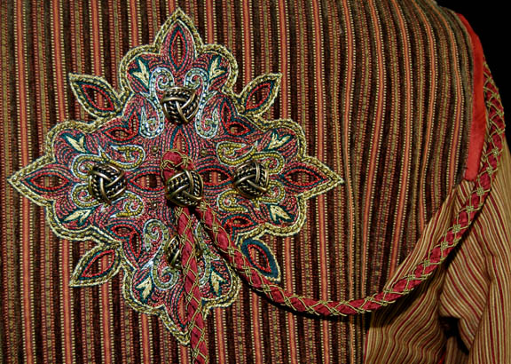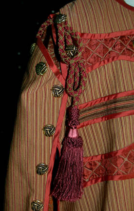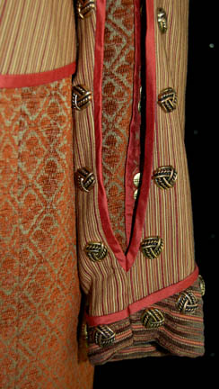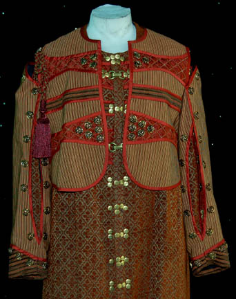 Description: A costume featured in the Star Trek: Enterprise episode “Babel One”, wherein the “Enterprise NX-01” picks up a Tellarite ambassador and journeys to a planet called “Babel” for peace talks with the Andorians. This costume is for wear by Kevin Brief in the role of the assistant to the Tellarite ambassador, “Naarg”, and is a full-length, long-sleeved robe of sage and a rust colored, diamond pattern with geometric shapes inside, numerous brass-colored buttons, slightly reflective, copper colored accents on the sleeves and along the chest, more clasps and buttons down the front; a jacket of multicolored stripes, intricately carved copper colored buttons, more of the same reflective accents, a Tellarite sigil on the back with a tassels going further down the back and over the right shoulder, open sleeves, and overall style trousers that correspond to the stripes on the jacket. This lot includes an extra pair of identical, a sewn in tag that reads ‘Enterprise, Kevin Brief #088' and costumer’s tag that reads ‘Enterprise #88 Babel One, Naarg, Kevin Brief’.