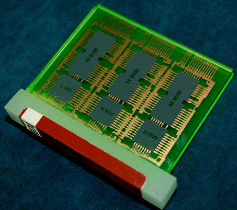 Description: A prop data module featured in various episodes of Star Trek: Enterprise for use in banks of similar backlit console pieces appearing in multiple sets. The item is a pair of acrylic layers, one clear and the other fluorescent green, adhered to one another and attached to a white plastic bar with an adhered application reading ‘074 AUX OPS LOG D/B 34' with other printed information. The acrylic pieces feature silk screened metallic gold and metallic silver circuitry. The item measures approx. 3.25 X 2.75 X .5 inches.